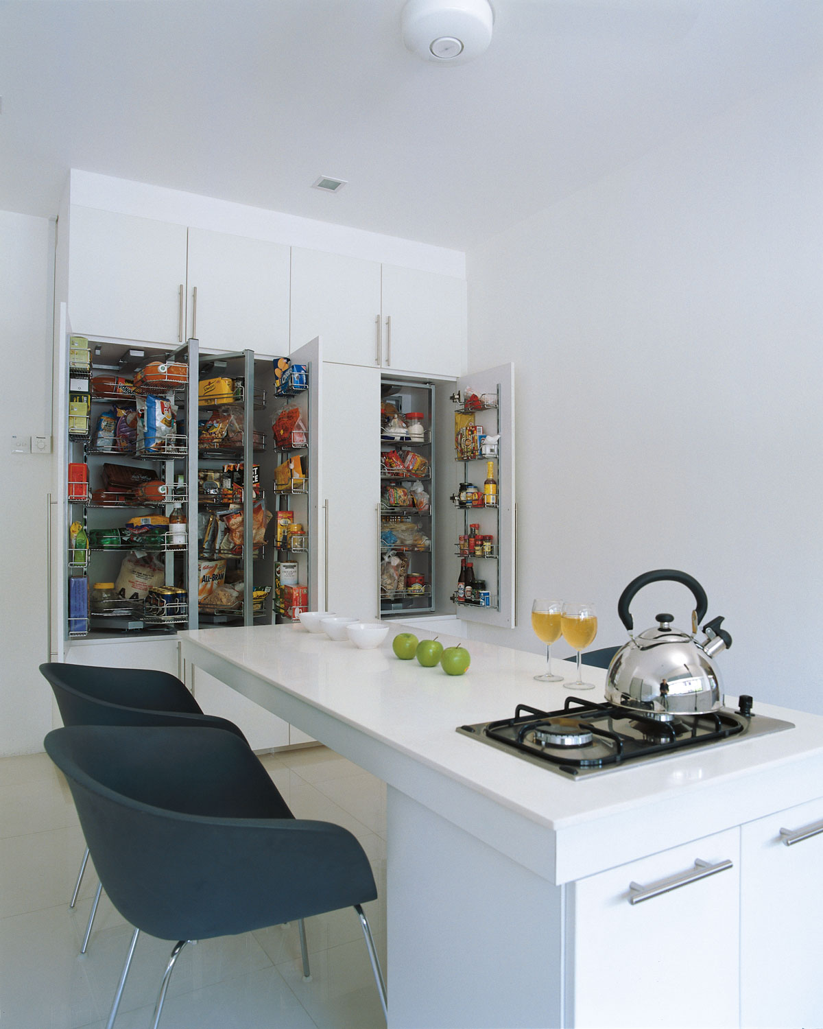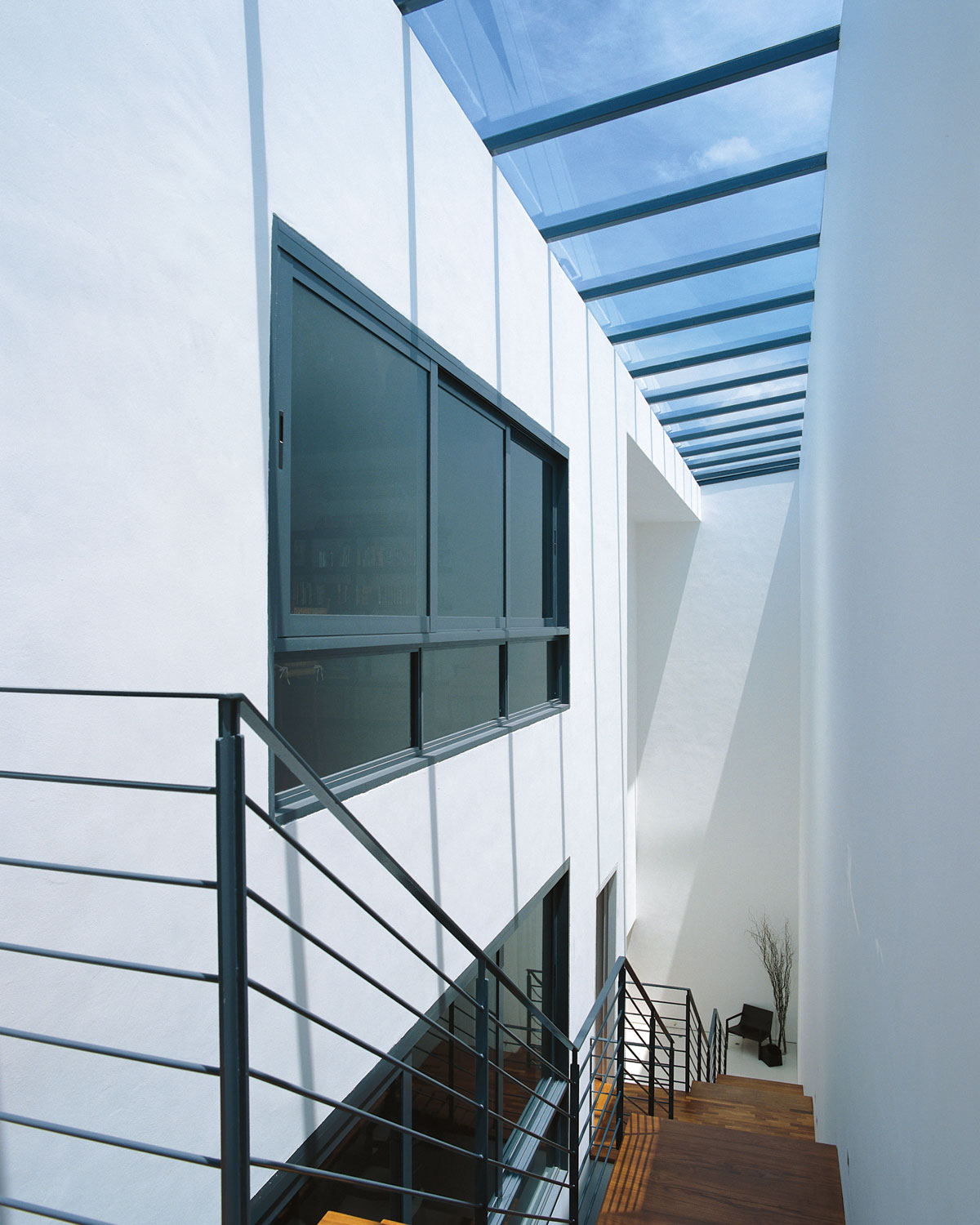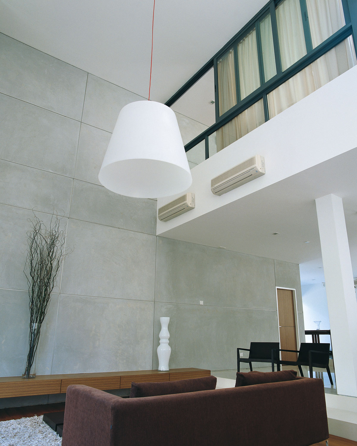 Modern but not cold, a double volume living area was created with an equally impressive skylight over the lenght of the entire 3 story staircase. Catering to the family members' different tastes, an interior design scheme neutral enough for anything was created. Each floor of the 3 storey semi-detached house is self-contained so that the different family units can have privacy.