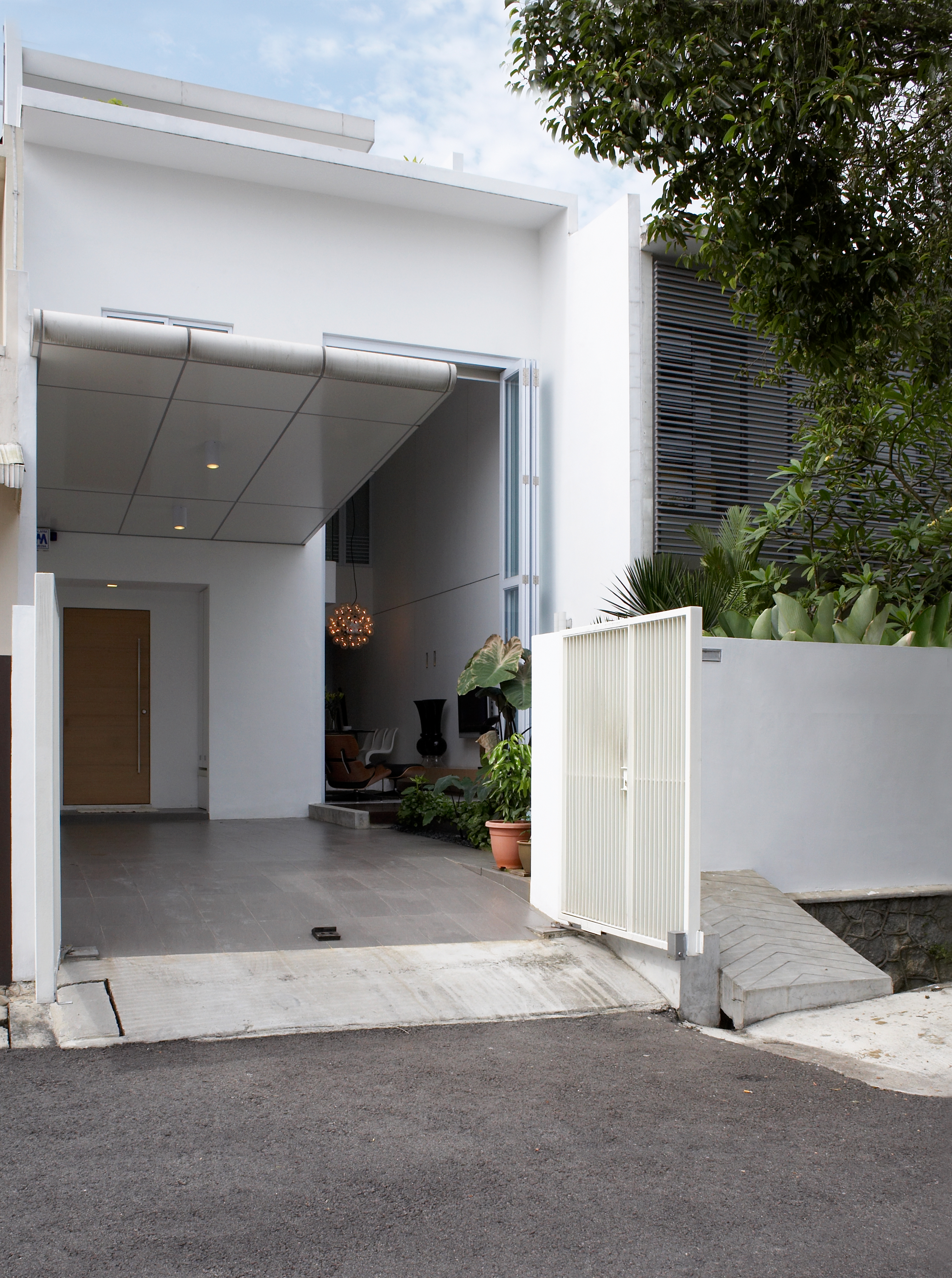 A set of tall folding doors cut into the facade and facing the garden. Measuring 6.5m in height, they accentuate the double volume interior space of the living and dining room. At the same time, when open, the doors help to blur the boundary between the inside and outside.