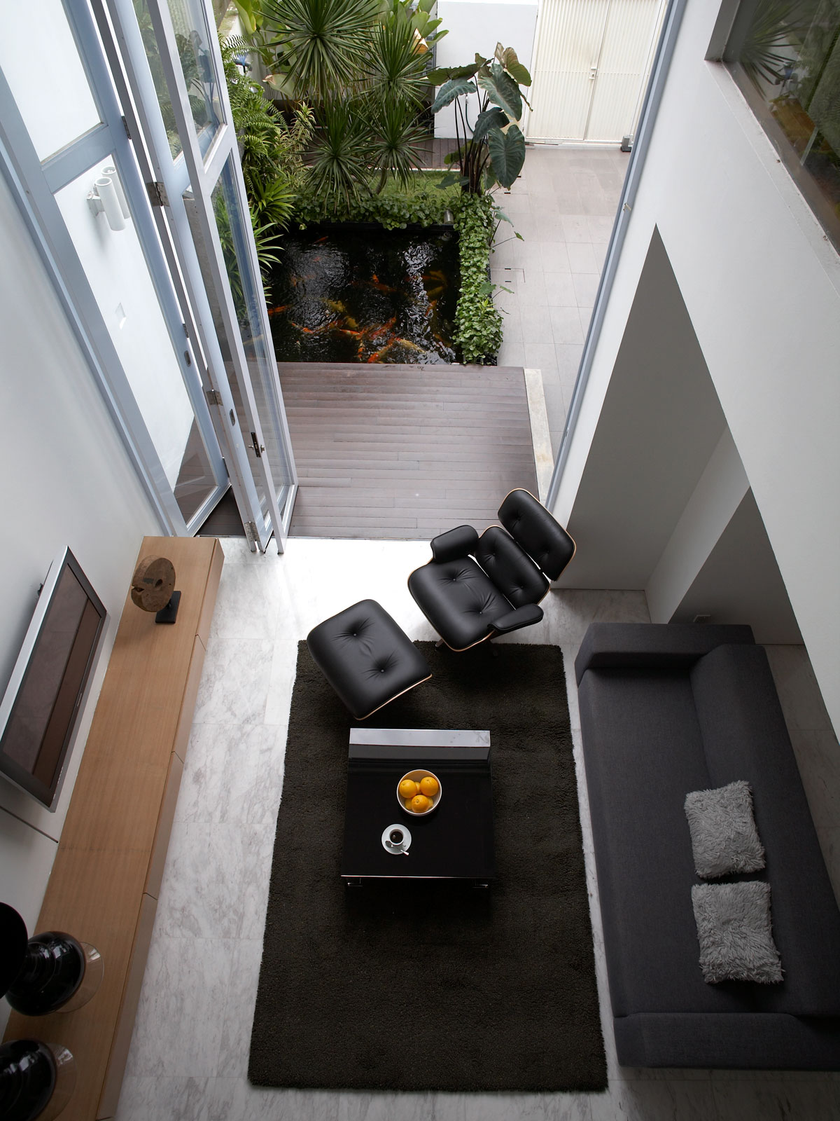 "The home owner is a koi fish enthusiat, so this was our way of extending the line of sight from the living room all the way into the pond, which is set just in front of the house"